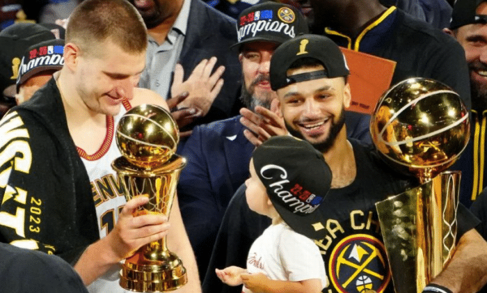 在今年总冠军颁奖仪式上,约基奇扛着女儿站在角落里,而且把MVP留在颁奖台上,最终掘金主帅马龙抱着约基奇的FMVP奖杯拍摄合影,穆雷抱着总冠军奖杯也坐在最显眼的位置;拍摄定妆照时,约基奇穿着大裤衩和拖鞋,和老婆孩子一起合影。
