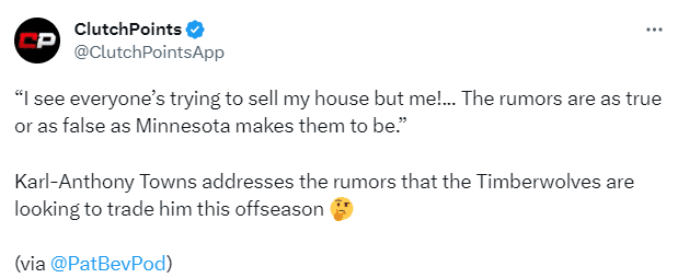 此前外界报道森林狼将在未来几周内探索交易唐斯,对于这样的交易流言,唐斯回应:当我看到外界关于我的交易流言时,我感觉每个人都想卖掉我的房子,除了我自己。简而言之,谣言是真的还是假的,都看明尼苏达想怎么做。