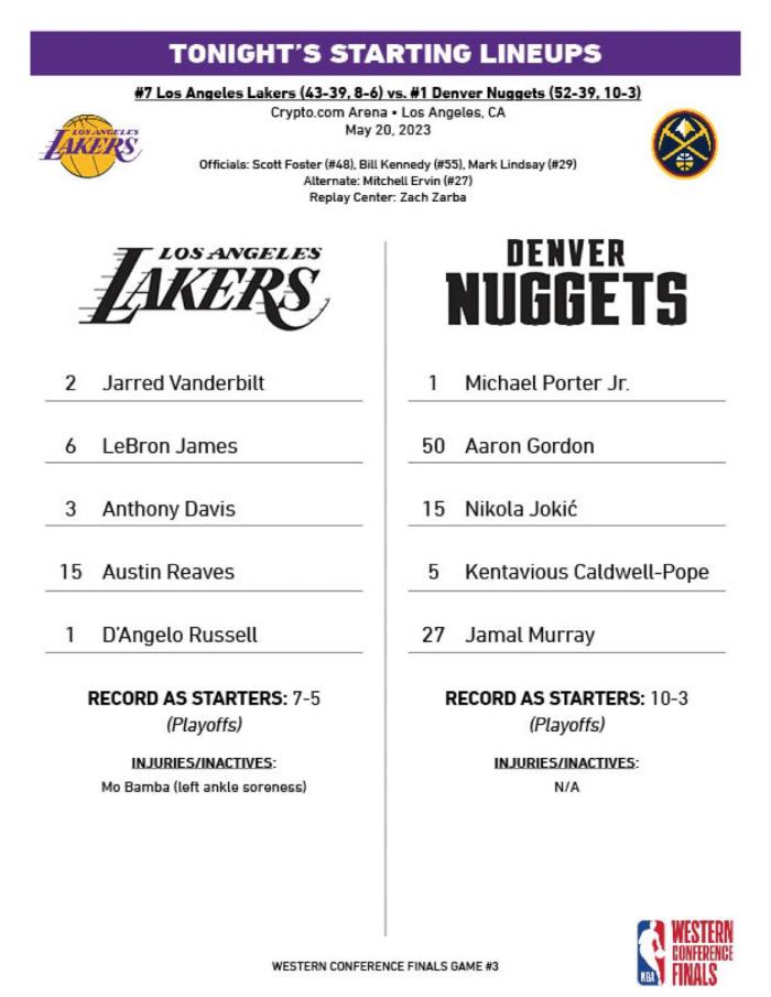 24直播网讯05月21日湖人掘金西决G3首发阵容出炉,湖人首发五虎是詹姆斯、浓眉、里夫斯、拉塞尔和范德彪,目标获胜拒绝0-3落后,这套首发季后赛7胜5负;另外湖人迎来利好消息,湖人中锋班巴最快西决G4复出;掘金延续原有首发,约基奇穆雷、小波特、戈登和波普继续搭档首发。