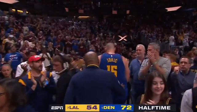 约基奇首节便抢下12个篮板球,半场16篮板包括6个前场板。而戴维斯半场2个篮板。掘金全队半场36个篮板,而湖人只有13个。此外,掘金半场13个前场篮板,湖人只有2个。如此巨大的篮板球劣势,让比赛变得有些一边倒。如果不是詹姆斯首节末段的发挥,以及戴维斯第二节进攻端的回勇,湖人也许半场就会崩盘。特雷杨也盛赞约基奇:他太离谱了!