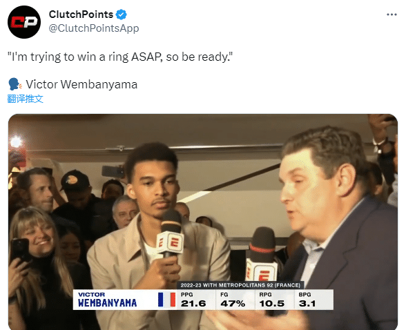 文班亚马接受采访时表示:我会努力尽快拿下一个NBA冠军。所以,准备好吧。