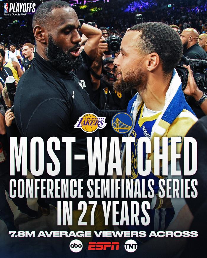 24直播网05月16日讯 湖人勇士大战已经落下帷幕,湖人4-2淘汰勇士从而晋级西决,据NBA官方统计,湖人对阵勇士的系列赛平均收视人数为780万,成为27年来收视率最高的分区半决赛系列赛。