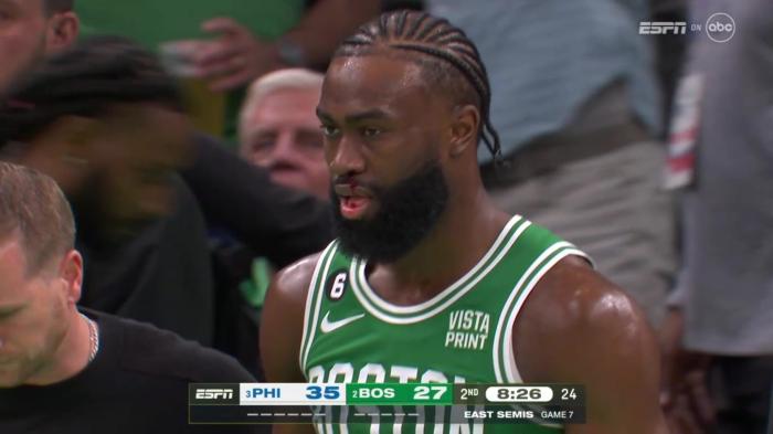 杰伦-布朗和哈登争夺球权冲入76人替补席,布朗有一个拉拽哈登球衣的动作,裁判未吹罚犯规,之后76人球员尼昂坐在替补席拉拽布朗的膝盖引冲突,布朗冲着费城替补席怒喷,双方发生口角,最终布朗和尼昂各自吃到一次技术犯规。