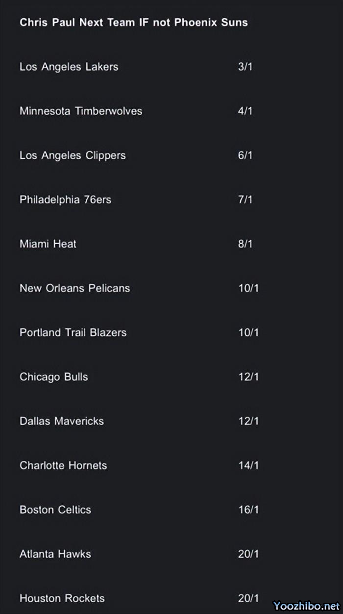 24直播网05月13日,名记Tim MacMahon报道称,太阳预计将在今年夏天积极兜售克里斯-保罗,保罗下赛季很可能会在一支不同的球队打球。 保罗本人回应交易流言,而他的最新下家赔率出炉:湖人成为头号热门。CP3有望联手好友詹姆斯再冲冠?