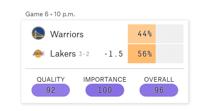 勇士当然希望能把系列赛逼入抢七大战,但湖人主场今年季后赛还没输过球,大家认为这轮系列赛会有抢七吗?知名大数据网站FiveThirtyEight给出的本场获胜概率:湖人56%,勇士44%。