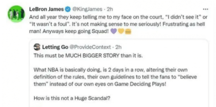 詹姆斯当时写道:“整整一年,他们一直在球场上当着我的面跟我说,‘我没看到’或‘这不是犯规’。对于我来说,这没有任何的意义!这真的是令人沮丧,但是无论如何,球队会继续前进。”