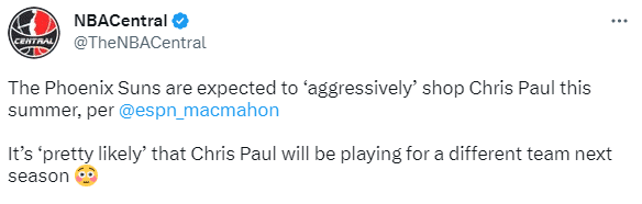 据名记Tim MacMahon报道,预计太阳会在交易市场上积极兜售克里斯-保罗,保罗23-24赛季很有可能在一支不同的球队打球,相信太阳会尽力在6月28日之前交易保罗,这个时间点保罗的合同保障部分将由1580万增加到3080万美元。