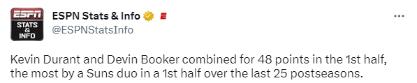 2、杜兰特和布克上半场合砍48分,成为过去25年赛季太阳队季后赛上半场得分最多的组合