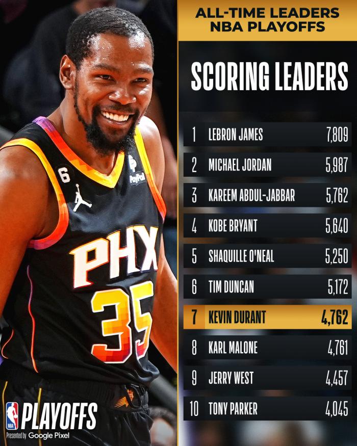 9、杜兰特和布克季后赛第三次同砍30+创队史最多纪录