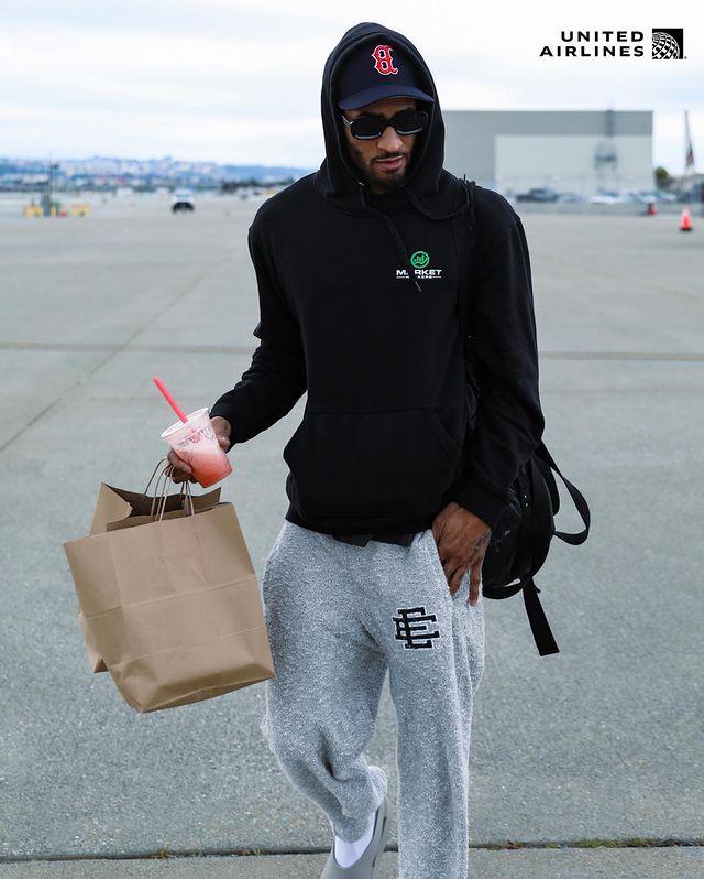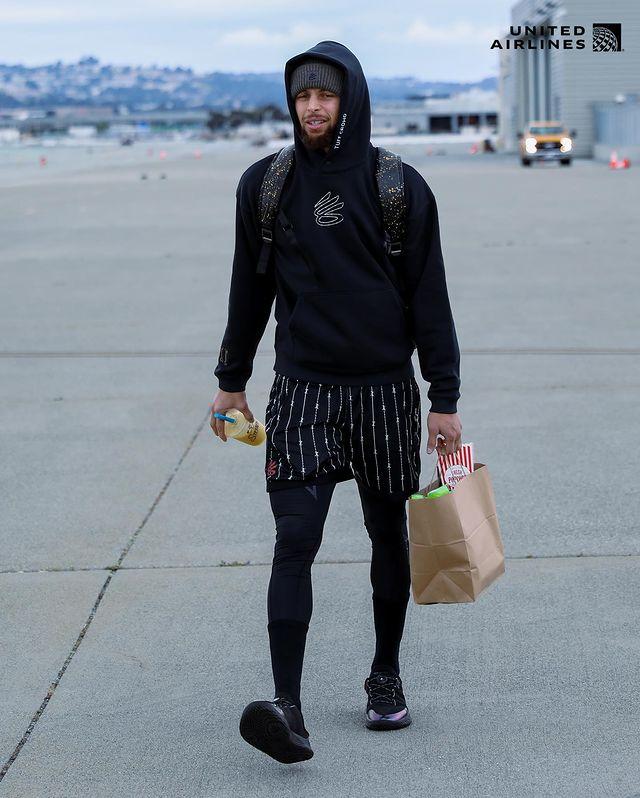 库里身穿黑色连帽卫衣和短裤以及紧身裤,戴着两顶帽子,背着双肩包,拿着饮料和爆米花,登上飞机时,库里表示:我们就要飞往LA,我听说每年这个时候天气很好,我非常兴奋,我们去拿下它吧。