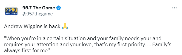 24直播网04月05日讯 ,安德鲁-维金斯正式归队,时隔49天终于露脸,维金斯回应回归:永远把家庭放在第一位;维金斯感谢众人,相信很快就能复出。