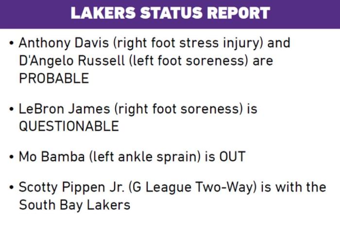 湖人官方公布下一场对阵爵士的伤病报告,安东尼-戴维斯(右脚应力伤势)、拉塞尔(左脚酸痛)大概率出战(75%出场可能);詹姆斯(右脚酸痛)出战成疑(50%出场可能),班巴(左脚踝扭伤)和小皮蓬(发展联盟)将继续缺席。