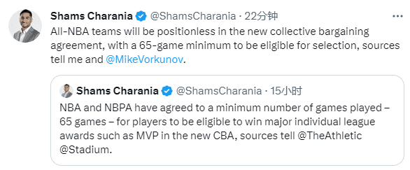 24直播网04月02日讯 ,NBA最佳阵容的评选新规出炉,据名记Shams报道,在新的劳资协议谈判中,NBA最佳阵容的评选将取消位置区分,且入选最佳阵容的前提条件是至少打65场比赛;新规将在新赛季开始执行,MVP的评选也需要至少打65场比赛。