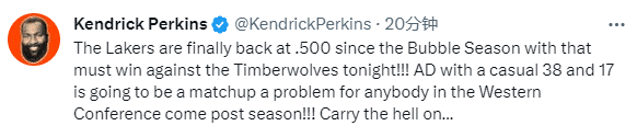 赛后名嘴帕金斯狂赞浓眉,发推写道:“自泡泡园区那个赛季以来,湖人的胜率终于超过了五成,他们赢下了对阵森林狼这场必须赢的比赛。在季后赛来临的时候,对于任何一支西部球队来说,面对随随便便就能砍38分17板的浓眉,这对位都将是个问题。”