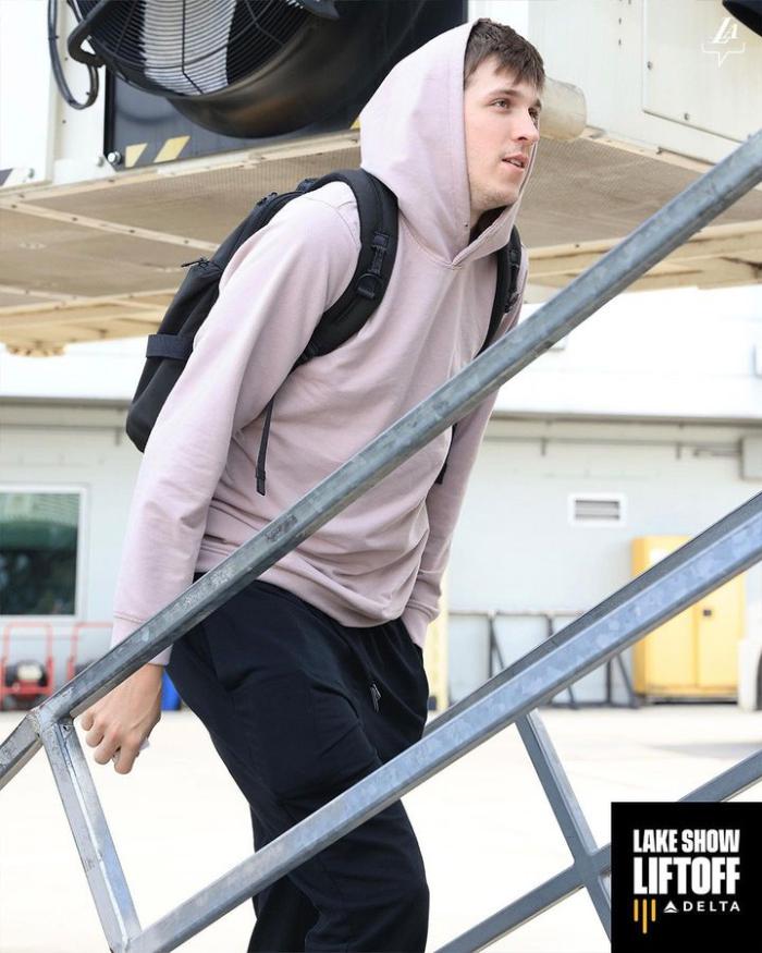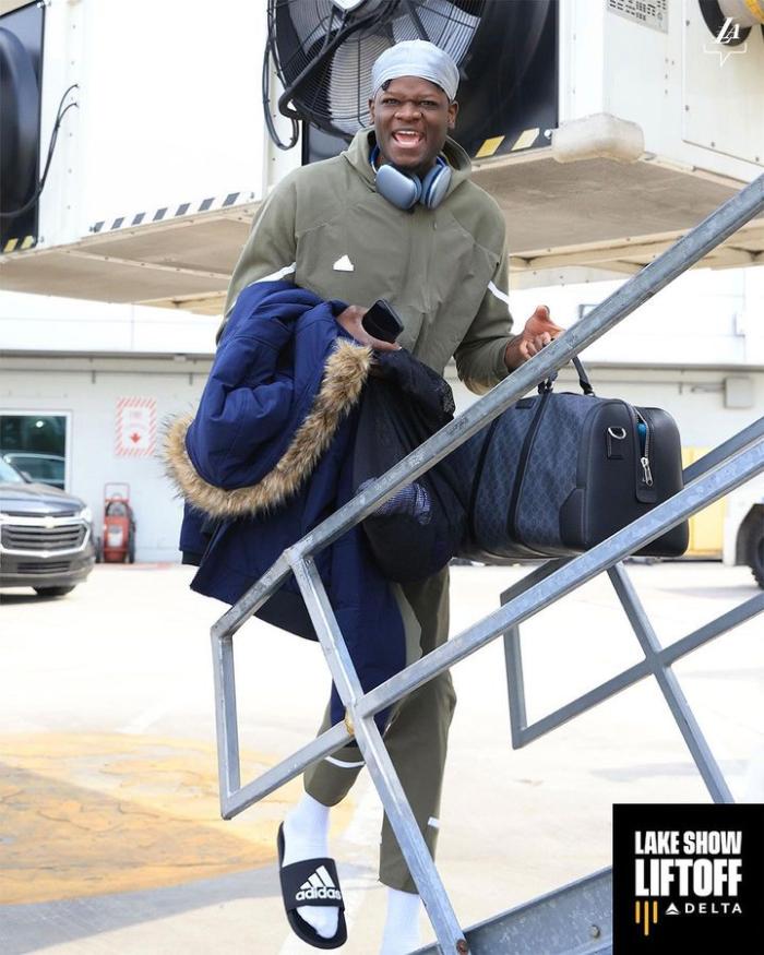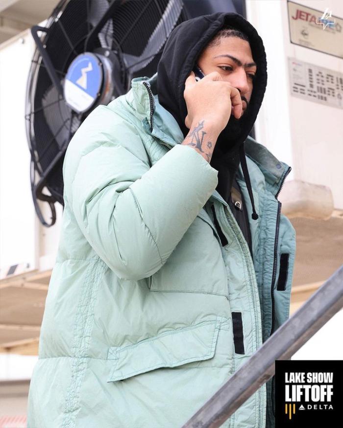 38岁詹姆斯身穿黑色连帽卫衣,戴着棒球帽和耳机,登机时露出挤眼吐舌的搞怪表情;拉塞尔身穿红色卫衣,刷着手机登上飞机,浓眉则是正在打电话,整个人的表情十分严肃,值得一提的是,浓眉穿着一件羽绒服。