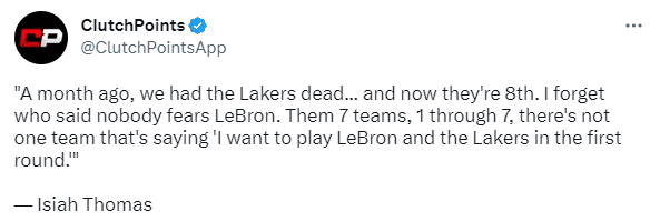 “微笑刺客”伊赛亚-托马斯在节目中表示:一个月前,我们都觉得湖人没希望了,可现在他们排在西部第8位,我忘记谁是没人害怕勒布朗,西部进入季后赛的球队之中,没有一支球队会说:我想要在季后赛首轮对阵湖人和勒布朗。