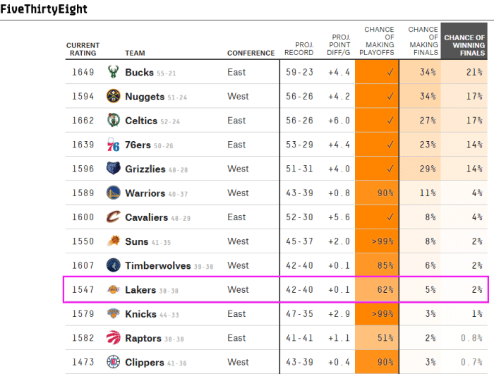 权威数据网站FiveThirtyEight最新预测,湖人晋级季后赛的概率为62%,进入总决赛的概率为5%,夺冠的概率仅有2%;雄鹿(21%夺冠概率)、掘金(17%)和凯尔特人(17%)是夺冠概率排在前三的球队,卫冕冠军勇士夺冠概率是4%。