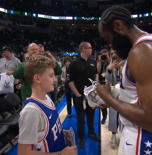 赛后哈登把球鞋签名后送给76人小球迷,接受采访后,登帝两人有说有笑,一起返回更衣室。
