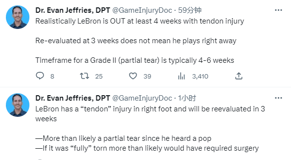 詹姆斯免遭中足扭伤、足底筋膜撕裂以及附跖关节损伤的严重伤病,但右脚肌腱拉伤仍不容小觑;名记表示詹姆斯现在就可以忍痛继续参加比赛,但这风险太大,湖人需要不断赢球为他争夺康复时间;医学专家Evan Jeffries表示詹姆斯遭遇右脚肌腱二级拉伤,通常康复期为4-6周。