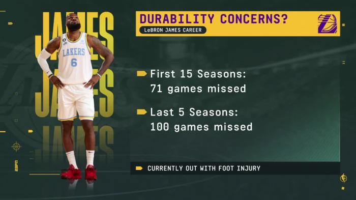 湖人做好了詹姆斯因伤缺席剩余常规赛的准备,本赛季,詹姆斯因伤缺席了16场比赛(湖人6胜10负),据统计,詹姆斯生涯前15个赛季总共缺席71场比赛,而过去5个赛季,詹姆斯已经缺席100场比赛,过去几年,强如铁人詹姆斯也遭遇伤病的侵袭。