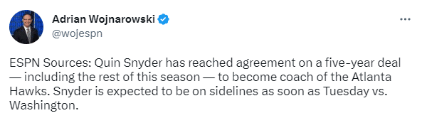斯奈德正式成为老鹰主帅:签下5年约4000万合同 执教杨冲季后赛