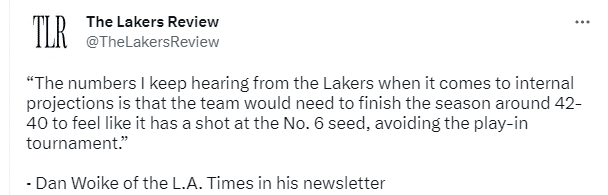 詹眉两大巨头都已表态全力冲击季后赛,哈姆透露湖人队的战绩目标是西部前六,据湖人记者Dan Woike报道,本赛季湖人内部的战绩目标是42胜40负左右,只有达成这样的目标,球队才有机会升到西部前六,从而避免参加附加赛。