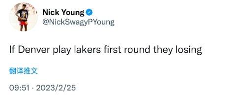 若湖人重返季后赛,尼克-杨看好湖人能够以下克上,发推写道:如果掘金季后赛首轮打湖人,那么他们会输。