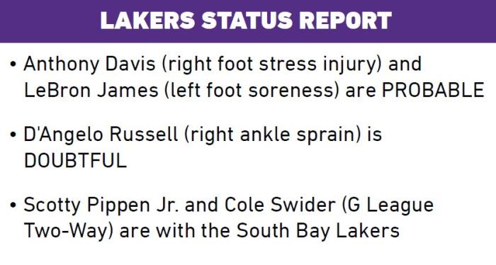 24直播网讯02月26日湖人官方正式公布下一场对阵独行侠的伤病报告,詹姆斯(左脚酸痛)和浓眉(右脚应激伤病)大概率出战 ,拉塞尔(右脚踝扭伤)大概率因伤缺席,小皮蓬和斯威德仍在发展联盟未被召回;詹眉带队正式开启三连客,拉塞尔随队出征。
