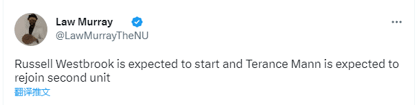 24直播网讯02月25日,据快船随队记者Law Murray报道,球队新援威少预计将首发出战,特伦斯-曼恩预计将回到第二阵容;名记揭秘快船签约威少内幕,乔治力排众议获小卡支持。