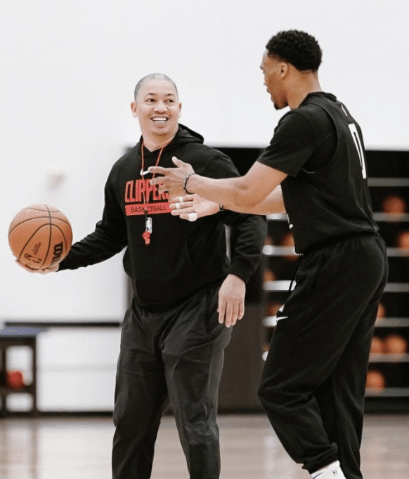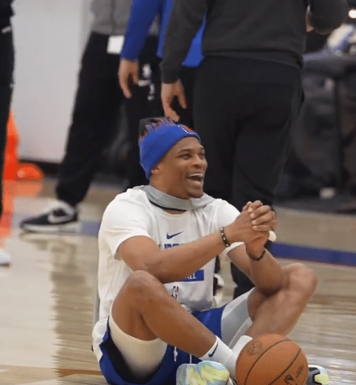 在快船队今天的训练中,威少身穿快船训练服,并且把球衣绑在身后,戴着快船队蓝色发带参加训练,泰伦-卢安排威少和普拉姆利、戈登、海兰德一起训练,威少持球组织进攻,队友上前给他挡拆,威少突破后把球传给空位的队友;训练中,威少助攻戈登命中三分,助攻普拉姆利轻松扣篮。