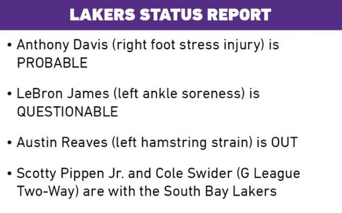 24直播网02月04日讯 ,湖人官方公布下一场对阵鹈鹕的伤病报告,浓眉(右脚应激反应)大概率出战,詹姆斯(左脚踝酸痛)出战成疑;里夫斯(左腿筋拉伤)、小皮蓬(发展联盟)和斯威德(发展联盟)继续缺席比赛。