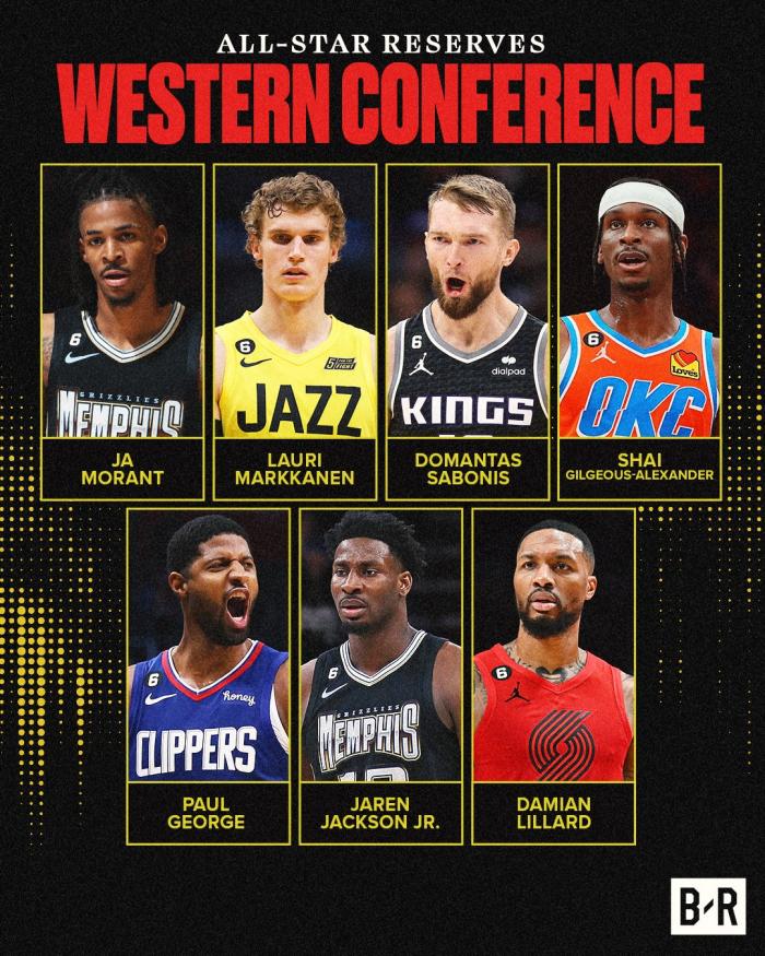 西部是詹姆斯(队长)、东契奇、库里、约基奇、锡安;替补阵容是莫兰特、小萨博尼斯、亚历山大(首次)、乔治、利拉德、马尔卡宁(首次)和小贾伦-杰克逊(首次)。