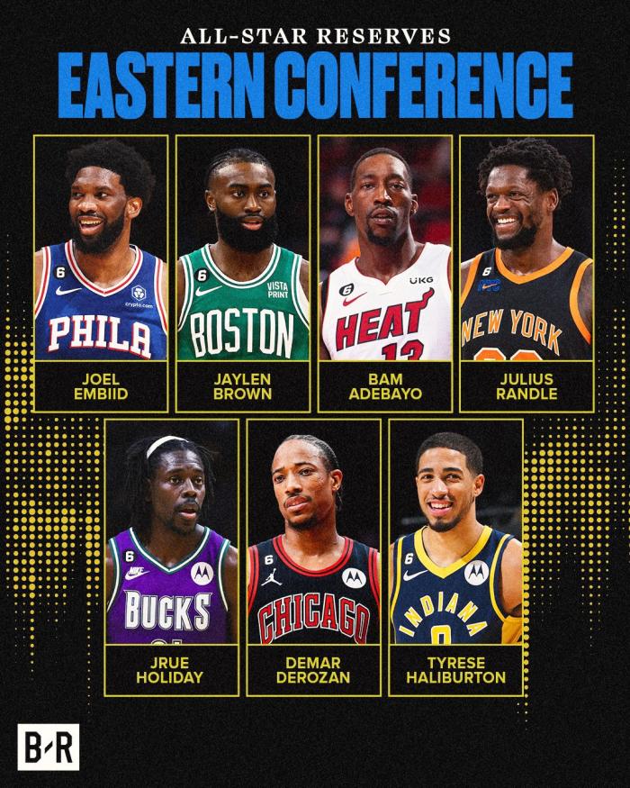 东部是字母哥(队长)、杜兰特、塔图姆、欧文、米切尔;替补阵容是恩比德、德罗赞、杰伦-布朗、阿德巴约、朱-霍勒迪、兰德尔、哈利伯顿(首次)