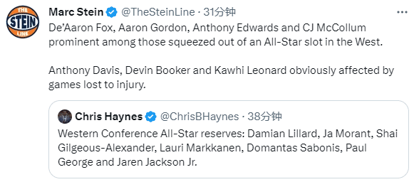 西部也是多名球星落选,名记Stein更推表示:戴维斯、布克、莱昂纳德落选全明星受到伤病因素影响很大。湖人队记Buha为浓眉鸣不平,发推表示:小贾伦-杰克逊虽然比安东尼-戴维斯多打了7场比赛,但只多打了12分钟。