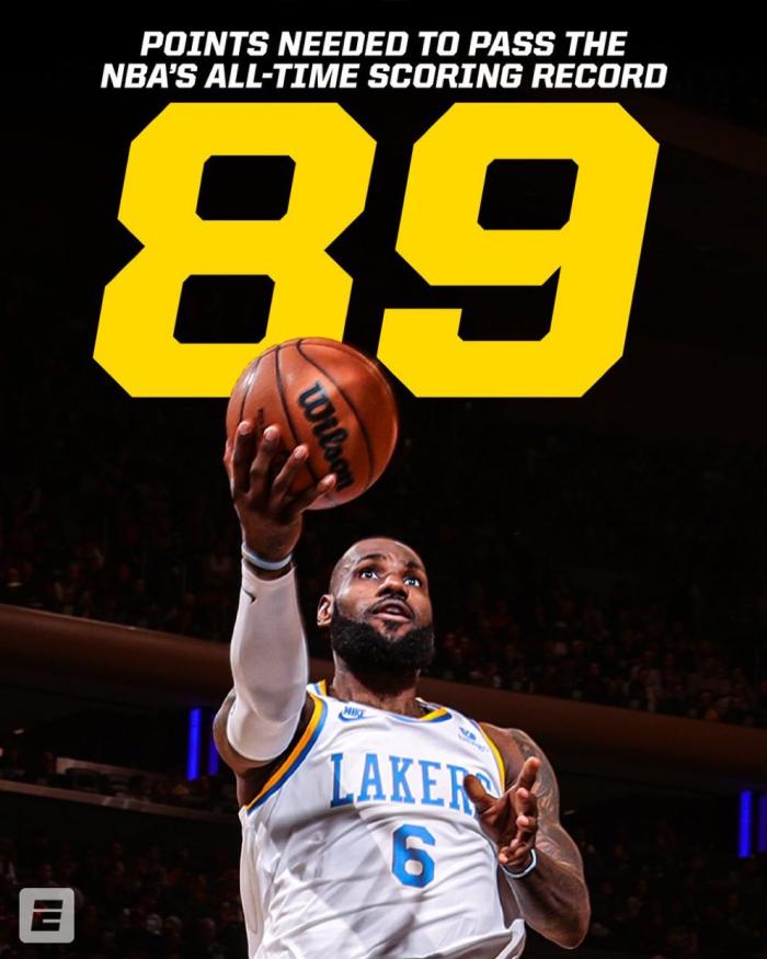 2月5日湖人客场对阵鹈鹕,也就是未来2场比赛,詹姆斯拿到89分,这有可能发生,本赛季詹姆斯曾连续2场累计轰下90分——12月31日对阵老鹰轰下47分,然后对阵黄蜂又拿到43分;38岁詹姆斯的状态正佳,确实有可能4天后提前加冕历史得分王。