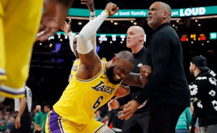 在湖人和凯尔特人末节还剩4.1秒,詹姆斯杀到禁区上篮错失绝杀,这一球明显被塔图姆打手犯规,NBA裁判报告也确定这是一次关键漏判,当时詹姆斯情绪激动,急得乱窜并且气得双膝跪地。