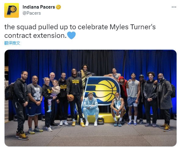 步行者官方还晒出全队合影,全队为特纳正式续约而庆祝,特纳抱着篮球,并且佩戴眼镜,满脸笑容十分开心。