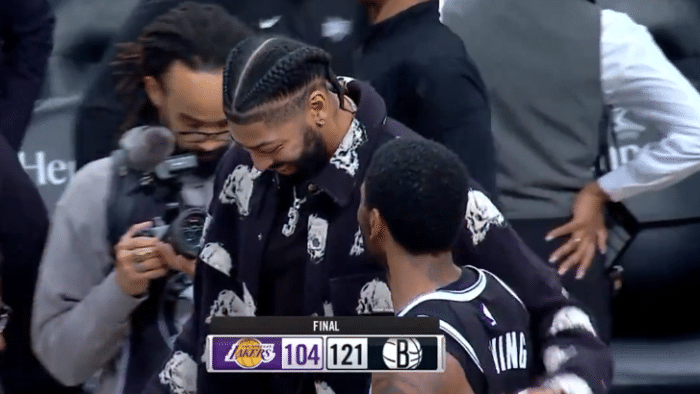 今天詹姆斯和浓眉两大巨头都因伤缺战篮网,湖人客场不敌篮网,比赛时间还没走完,詹姆斯就第一时间扭头离场,一脸沮丧和落寞;浓眉赛后拥抱欧文,并且和欧文寒暄有说有笑;湖人主帅哈姆、贝弗利也和欧文拥抱致意。