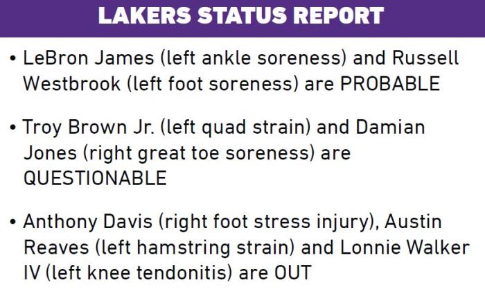 24直播网01月06日讯 湖人官方正式公布下一场对阵老鹰的伤病报告,詹姆斯(左脚踝酸痛)和威少(左脚酸痛)大概率出战;特洛伊-布朗(左四头肌拉伤)和达米恩-琼斯(右脚趾酸痛)出战成疑;浓眉(右脚伤病)和里夫斯(左腿筋拉伤)和沃克(左膝肌腱炎)缺席;上一场90度崴脚的施罗德伤势无碍,不在伤病名单上。