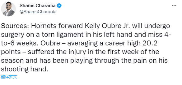 22-23赛季开打第一周就不幸受伤,乌布雷带伤作战两个多月,如今他决定接受韧带修复手术,预计伤停4-6周,他的伤停是对黄蜂队的一大打击,目前黄蜂10胜28负排在东部第14位。