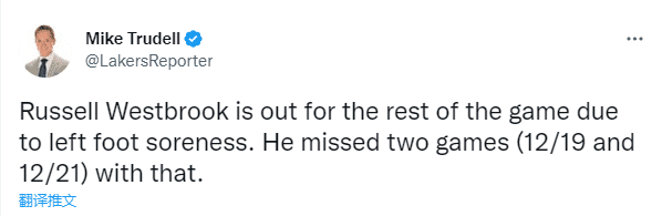 威少仅仅打了上半场,8投1中仅仅拿到2分,急停干拔和三分都打铁,仅靠突破上篮拿到2分,进攻端,威少送出2次助攻,助攻詹姆斯得分;下半场威少没有上场,湖人官方宣布威少因左脚酸痛而退出比赛,因伤提前退赛,此前威少因左脚酸痛曾缺席了12月20日(对阵太阳)和12月22日(对阵国王)的比赛。