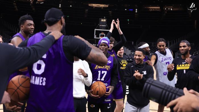 湖人官方晒出众队友在老鹰主场为詹姆斯唱生日歌的现场视频,詹姆斯满脸笑容十分开心,队友鼓掌,现场氛围非常好;詹姆斯将在38岁生日夜出战与老鹰的比赛。