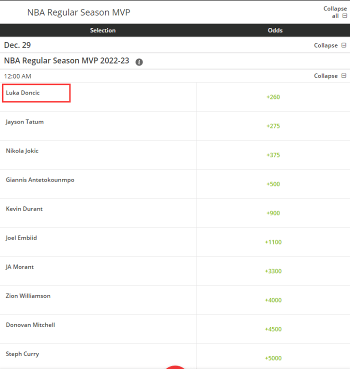 24直播网12月29日讯 ,NBA常规赛MVP最新赔率出炉,东契奇反超塔图姆升到第一,杜兰特升到第五,库里排名下滑到第10位。