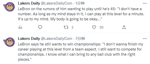 谈到关于打到45岁才退役的流言,詹姆斯表示:我没有具体的数字。只要我能保持头脑清醒,我就能在这个水平上打比赛,这取决于我的头脑。我的身体会没事的。