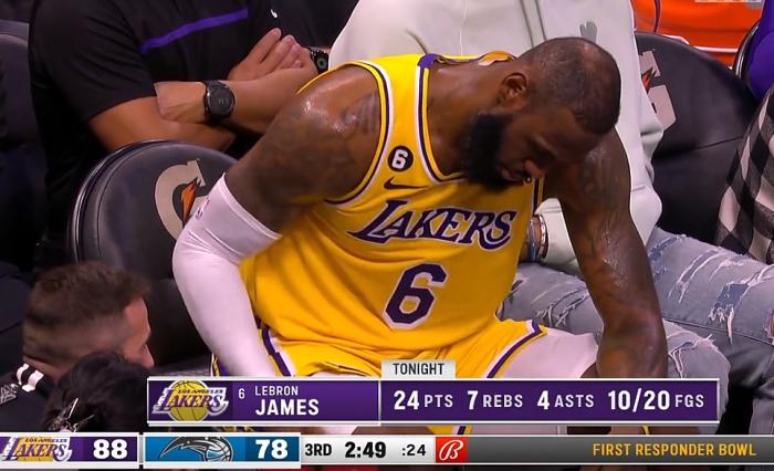 下半场,詹姆斯就像被激怒了似的,持球过掉班凯罗后翻身后仰跳投得分,反击中接里夫斯助攻直接空接暴扣,疯狂攻击禁区,单节上场9分钟独砍12分6篮板,下场休息坐在替补席确实累得够呛。