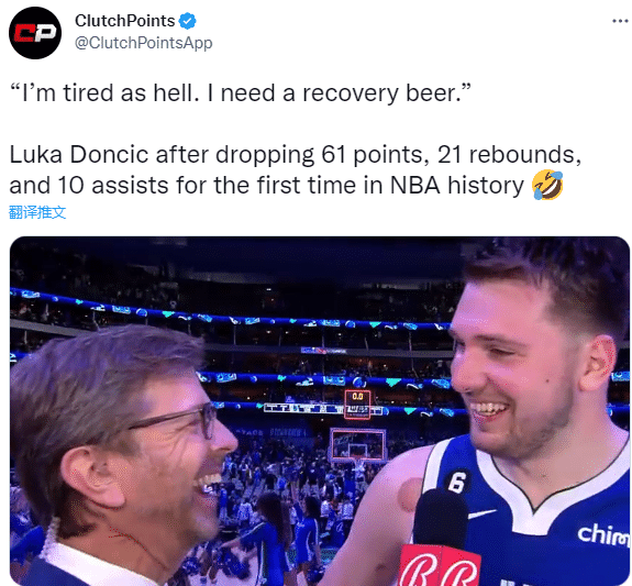 赛后谈到自己的超神表现,东契奇笑着表示:我累死了,我需要来点小酒恢复一下。