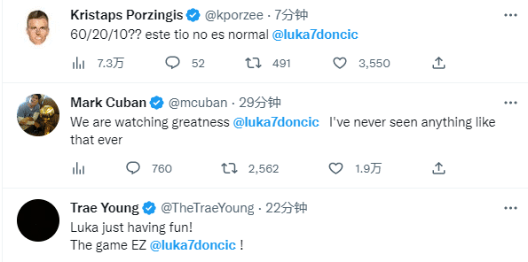 东契奇封神一战引盛赞,波尔津吉斯发推写道:60分20篮板10助攻?东契奇这个家伙太不正常了;特雷-杨:东契奇打得很开心,篮球精英。