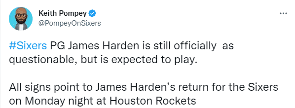 据76人记者Keith Ponpey报道,虽然哈登官方列为出战成疑,但他将复出回归,所有的迹象都表明哈登今天复出对战休斯顿火箭;里弗斯确定哈登复出,但哈登出场时间将会受限制,未透露具体的上场时间;之后76人官宣哈登复出,晒哈登自拍照并配文写道:我回来了。