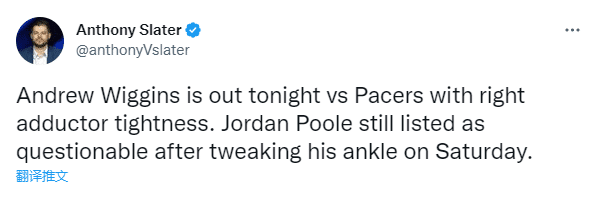 据勇士记者Anthony Slater报道,勇士前锋威金斯因右内收肌紧张将缺席今日对阵步行者的比赛,维金斯本赛季第3次缺席比赛,赛季至今,威金斯场均上场32.8分钟,得到19.1分5.1篮板2.2助攻1.4抢断0.8盖帽。