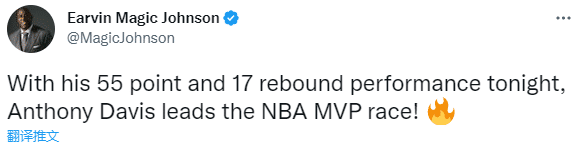 湖人名宿魔术师发推:安东尼-戴维斯凭借今晚55分17板的表现,领跑本赛MVP的角逐;欣喜地看到詹姆斯和戴维斯同时发挥出色,也让队友们变得更好。这就是湖人最近一直赢球的原因。